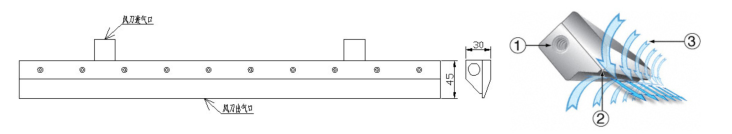③而形成一面薄薄的高強度、大氣流的沖擊氣幕,氣幕強非常均勻。氣刀具有噪音低(69db)分貝以下,耗氣量少,表面經過電鍍氧化處理,使用壽命10年以上,用起來節省90%以上等優點。